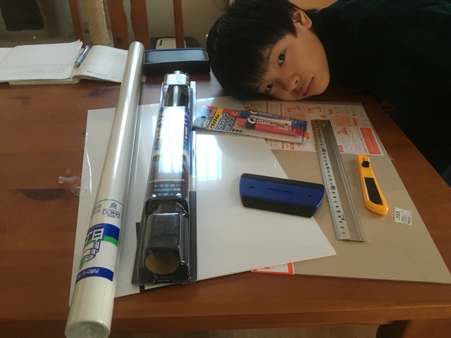 買ってきたのはアクリル板、塩ビ板、5%透過UVカットフィルム、アクリル用カッター、上質紙模造紙、2液接着剤、ゴムヘラ。